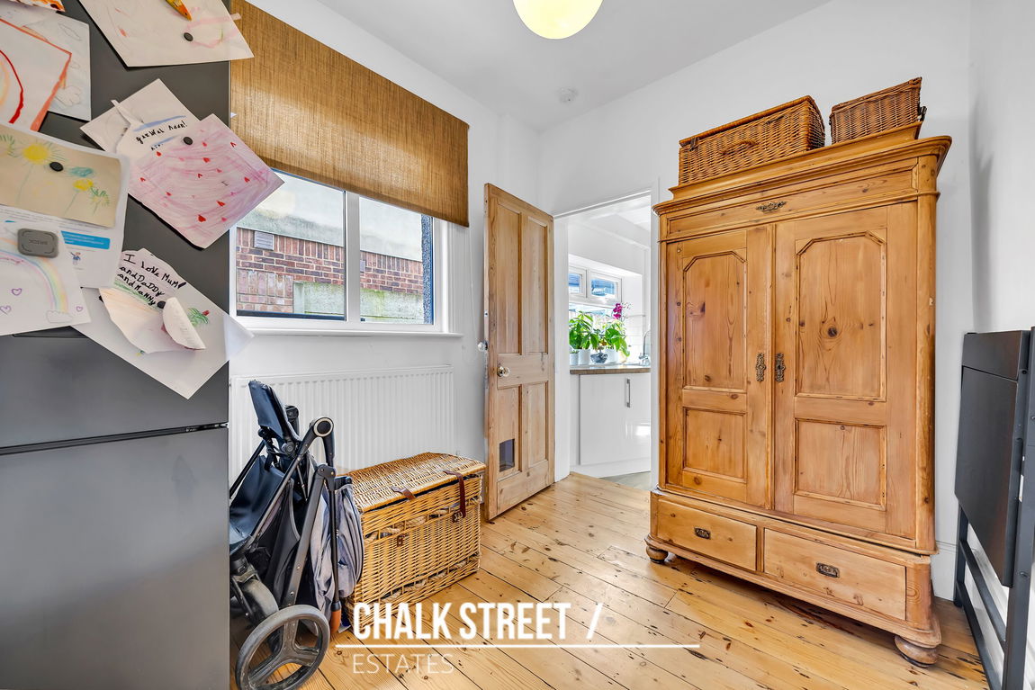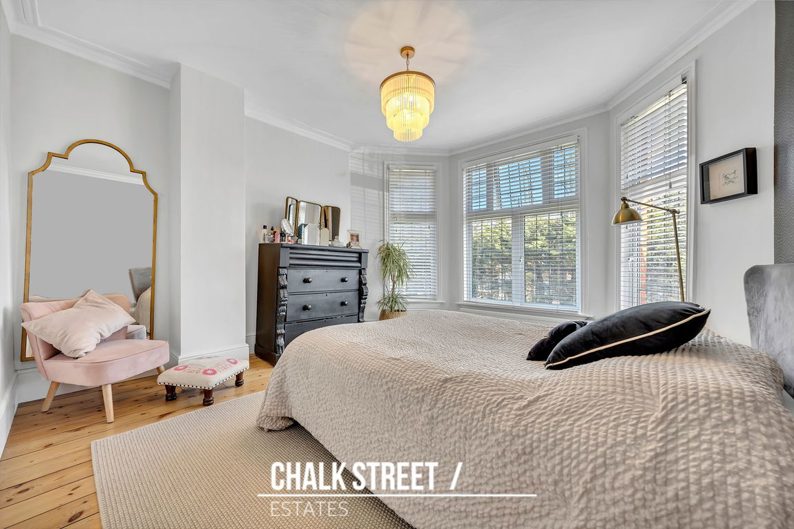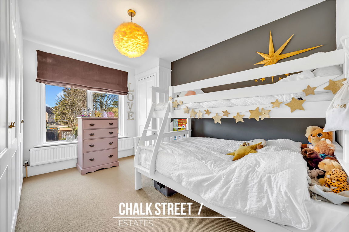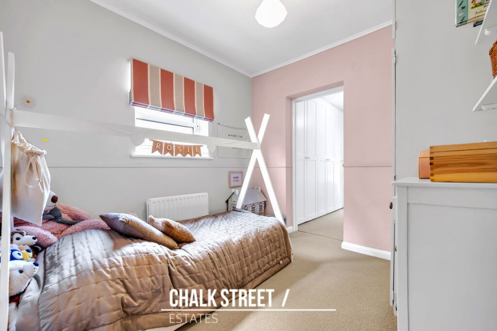 To the first floor, the principal bedroom is located at the front of the property and benefits from a walk-in bay window and fitted wardrobes. The second bedroom is another well-proportioned double, also featuring built-in storage. The third bedroom, again a double with fitted wardrobes, leads through to an additional room which is currently arranged as a walk-in wardrobe, but could also be used as a fourth bedroom, nursery or study if required.