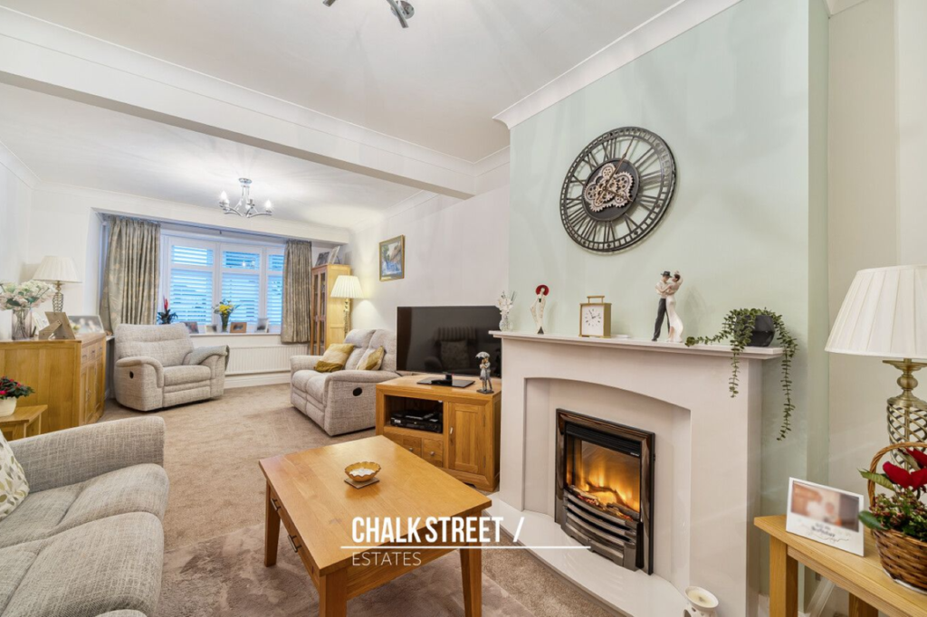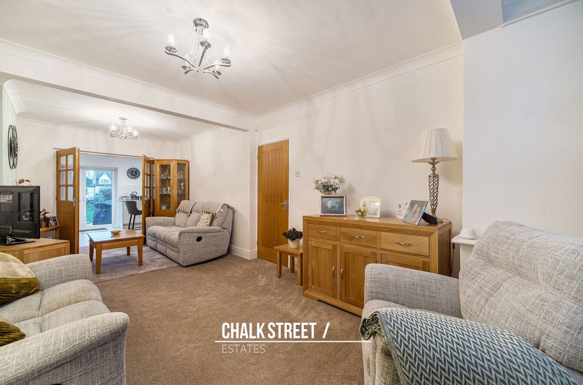 Drawing an abundance of natural light from the bay window to the front elevation, the reception room measures 22’11 x 10'11. Decorated with a neutral palette, further features include decorative cornice and a feature fireplace.