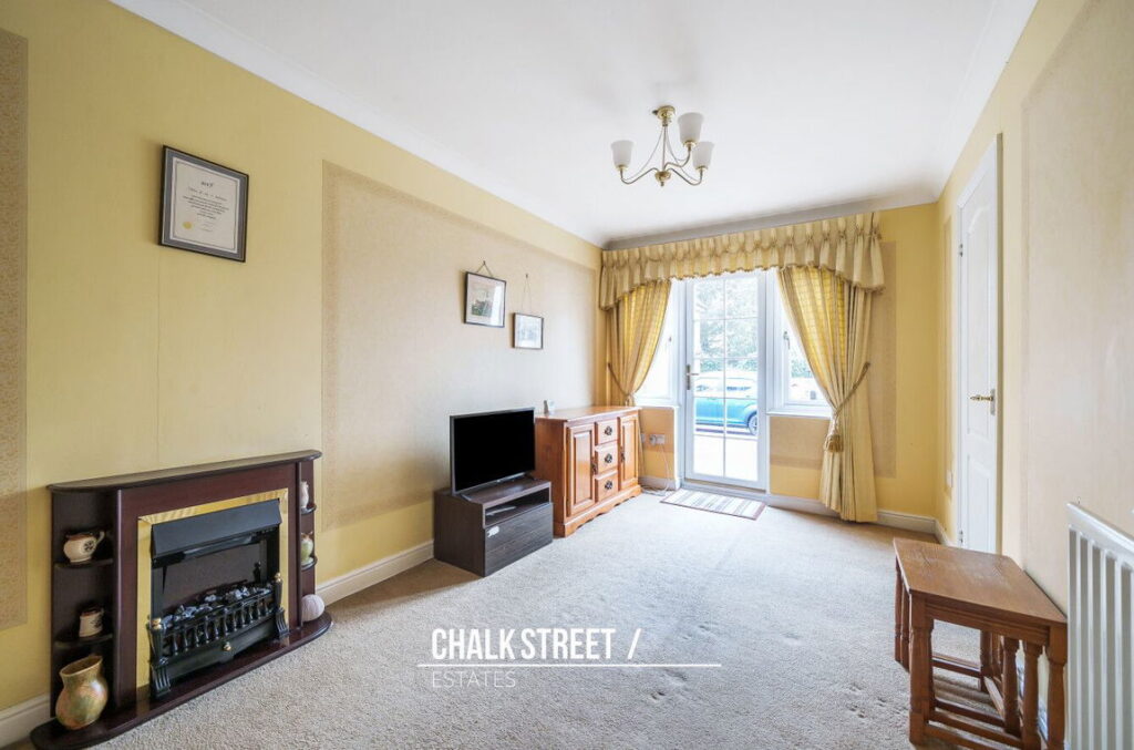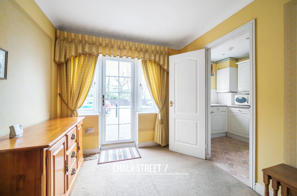 Positioned on the left of the home is the reception room, which measures an impressive 21’10 x 8’4 and provides adequate space for a dining table and chairs and is flooded with natural light from the French patio door. Situated off such is the kitchen which comprises numerous wall and base units, worktops to three sides and room for essential appliances.