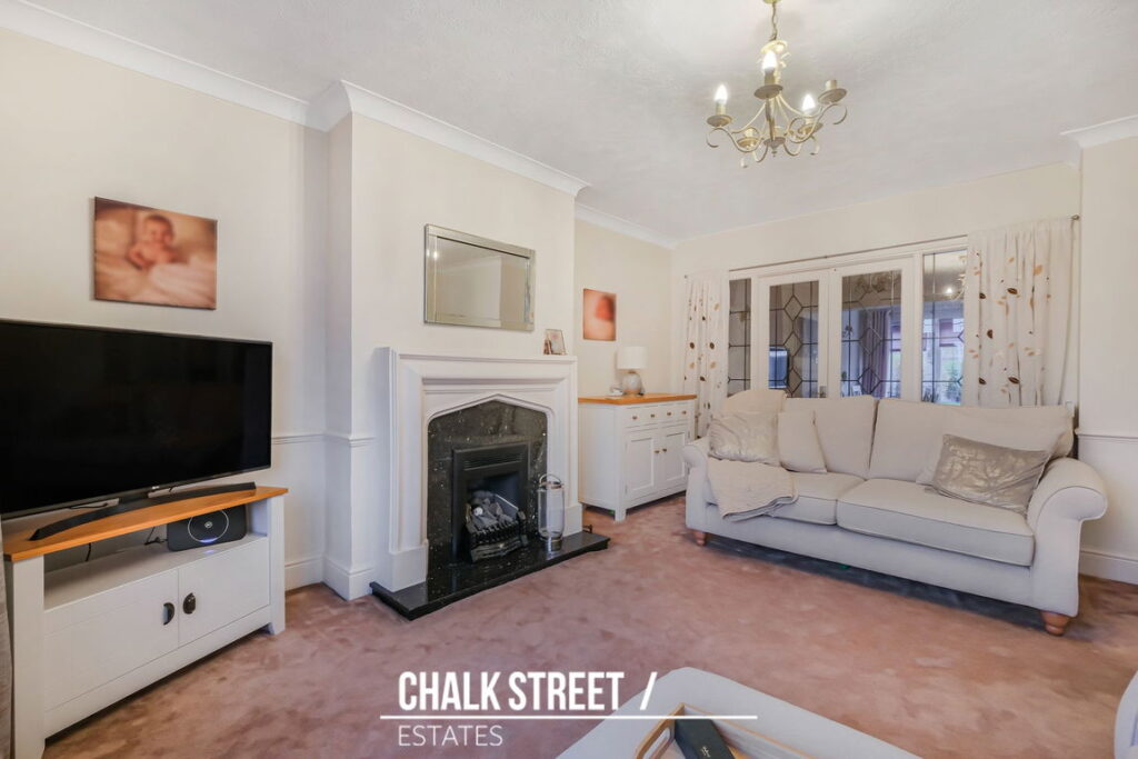 The generously proportioned reception room, illuminated by a large window to the front, is tastefully presented in neutral tones. This comfortable space, centred around a feature fireplace, boasts deep skirting, decorative cornice and carpets underfoot. Double doors seamlessly connect this room to the open-plan kitchen/dining area, creating a fluid and sociable environment.