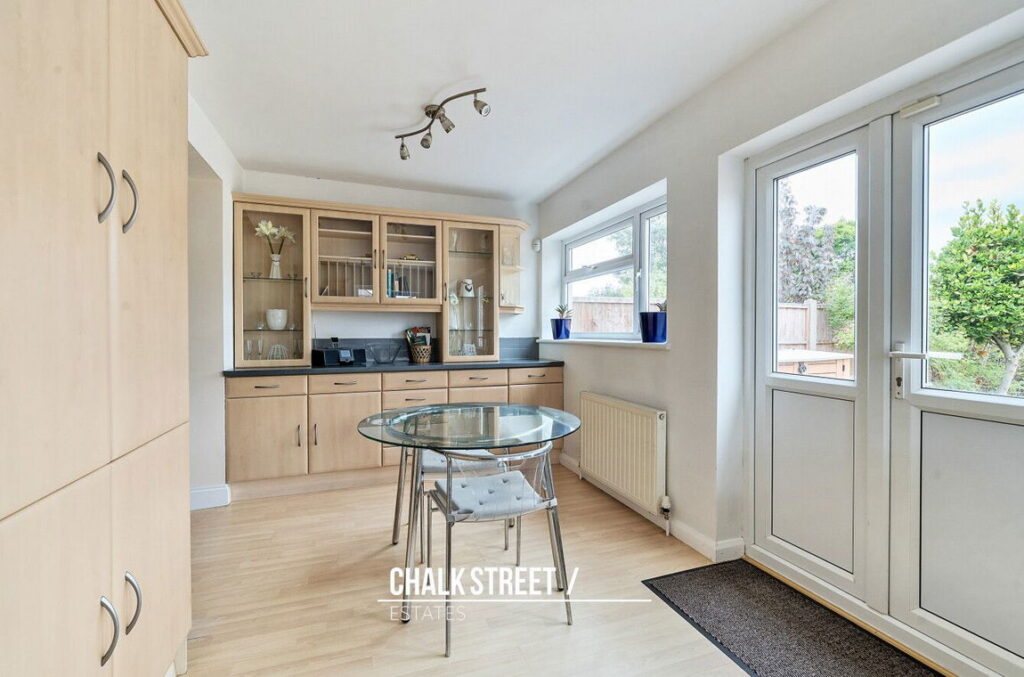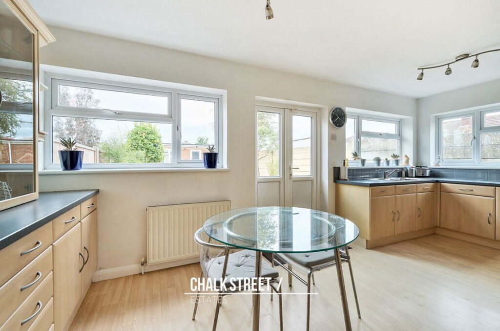 An archway provides access through to the kitchen / breakfast room which comprises numerous wall and base units, ample worktop space and room for essential appliances. The dual aspect windows and patio doors flood the area with natural light.