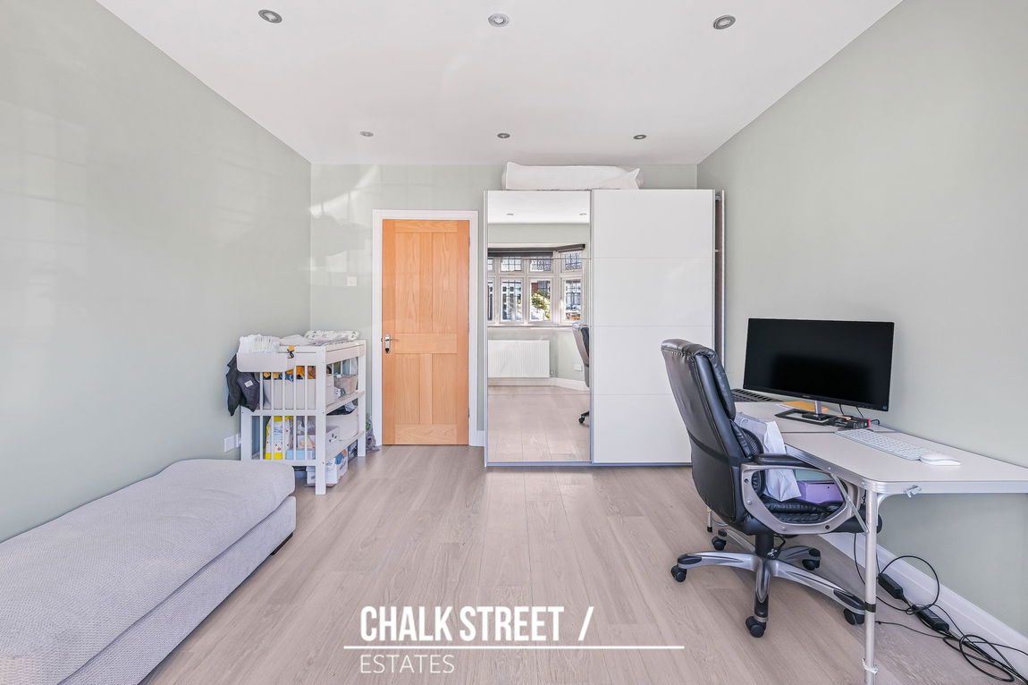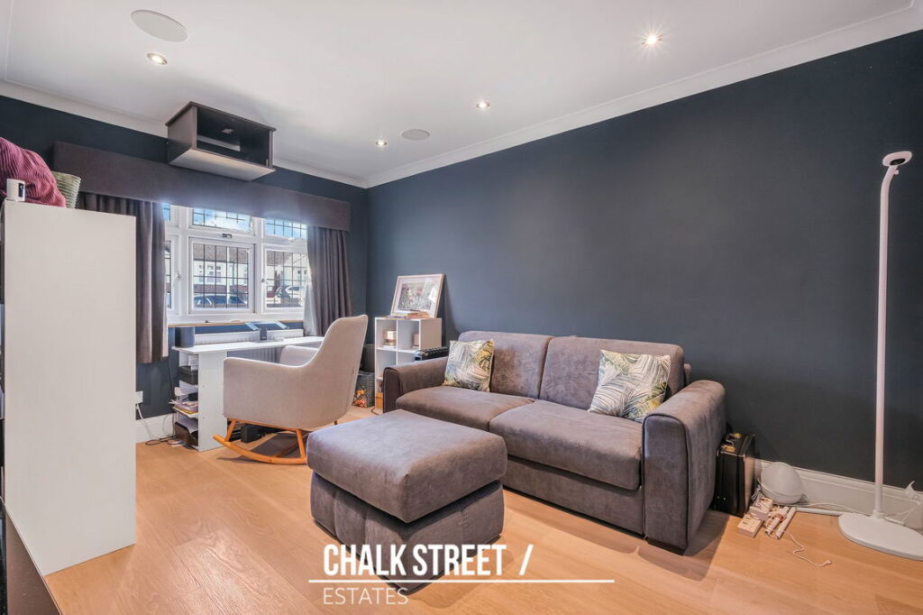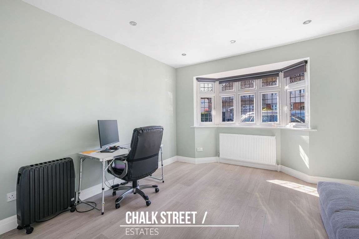 To the front of the property are two generously sized double bedrooms. The larger of the two features an attractive bay window and is currently utilised as a spacious home office with the other arranged as a reception room.