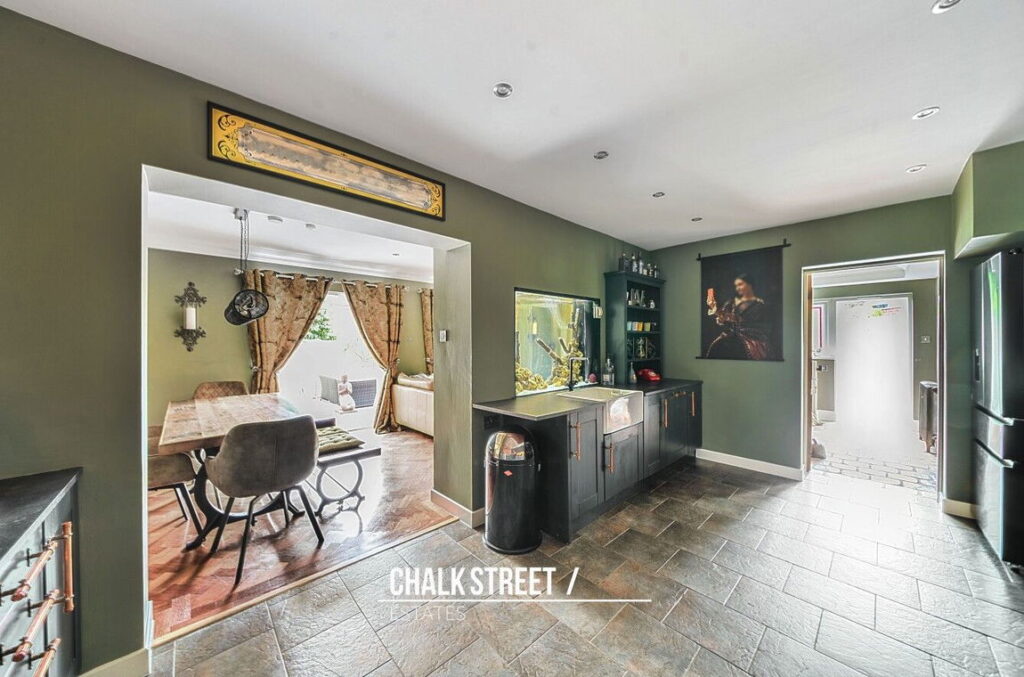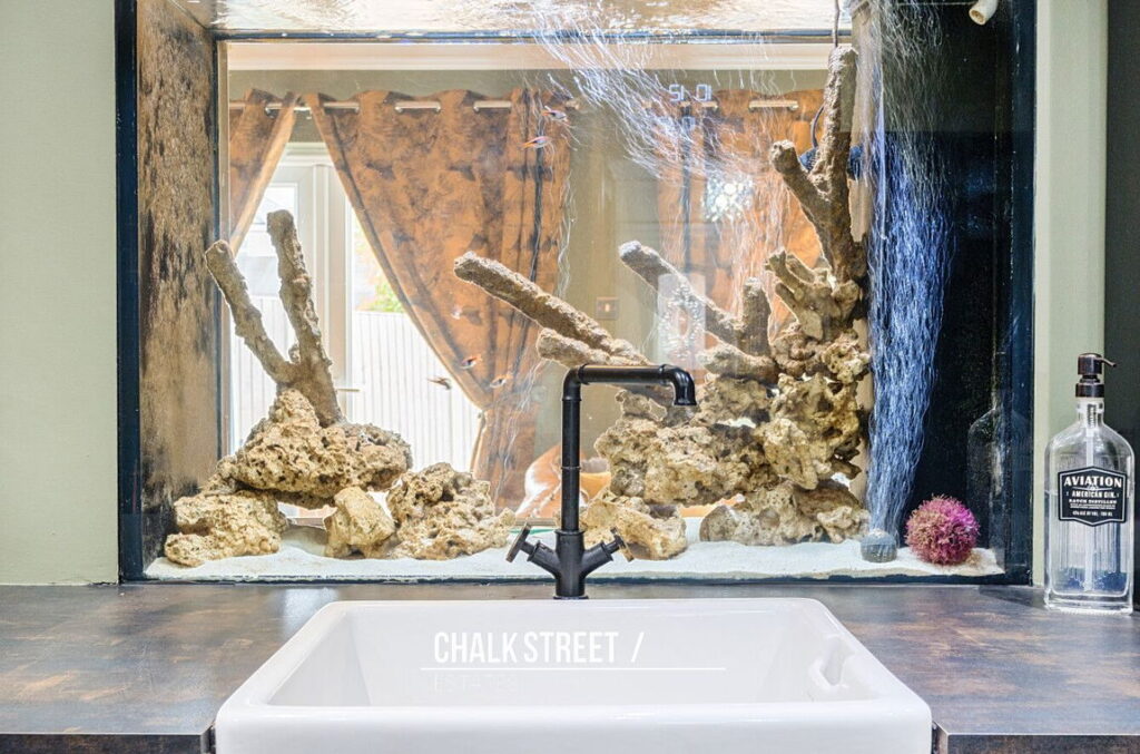 At the heart of the home, the stylish kitchen comprises ample worktops, numerous wall and base units, a fishtank fitted within the wall and room for essential appliances.