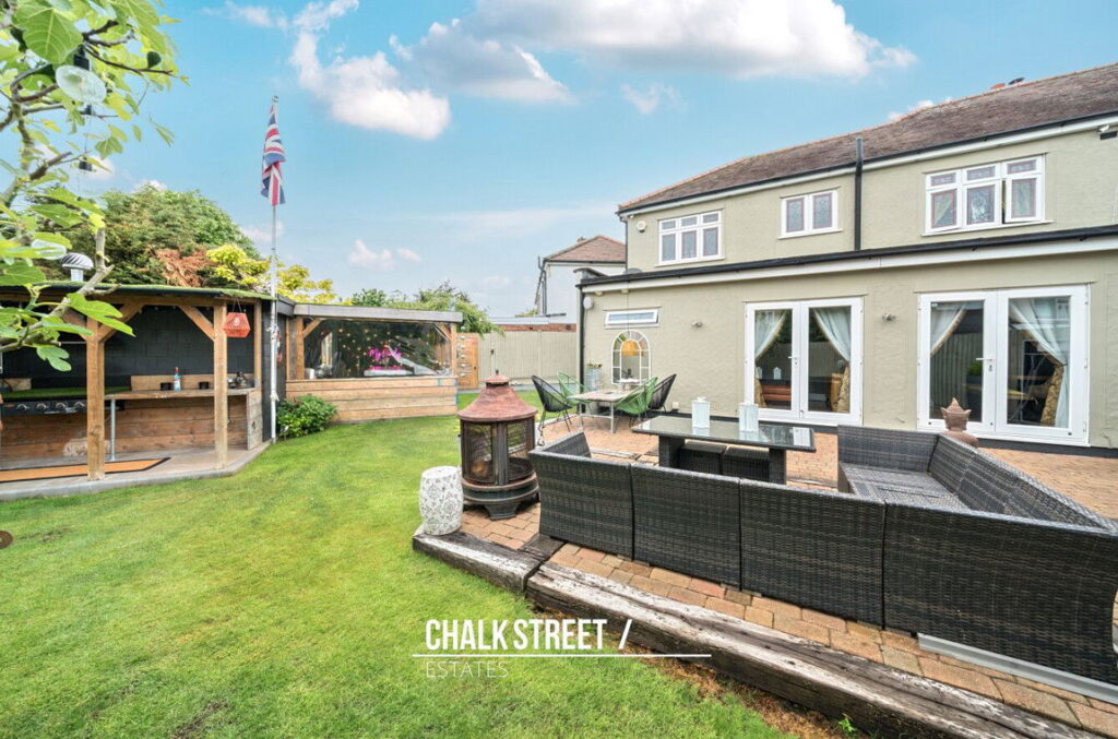 The south-facing rear garden commences with a large patio then is mostly laid to lawn. At the base of the garden there is large outbuilding (21’5 x 11’10) currently arranged as a bar, with covered stone patio area, ideal for entertaining on summer evenings.
