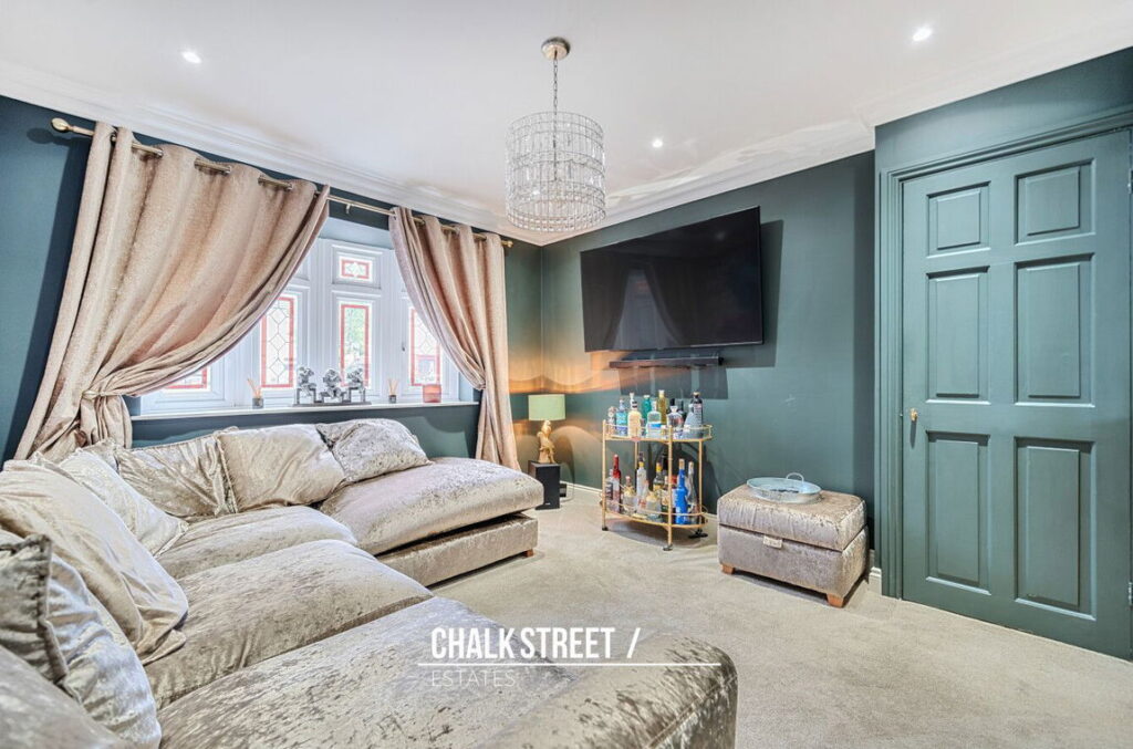 The living room is situated to the left and is decorated with a bright palette. Luxury carpets flows throughout whilst the room also benefits from decorative cornice and deep skirtings.