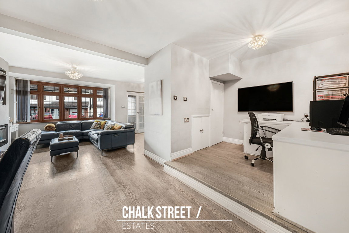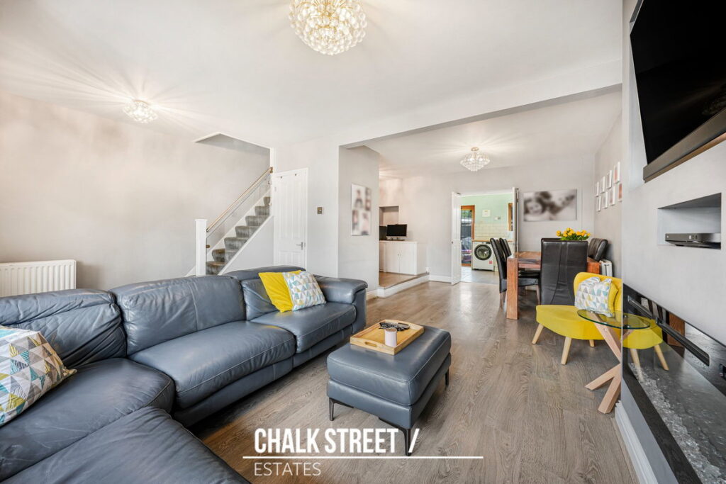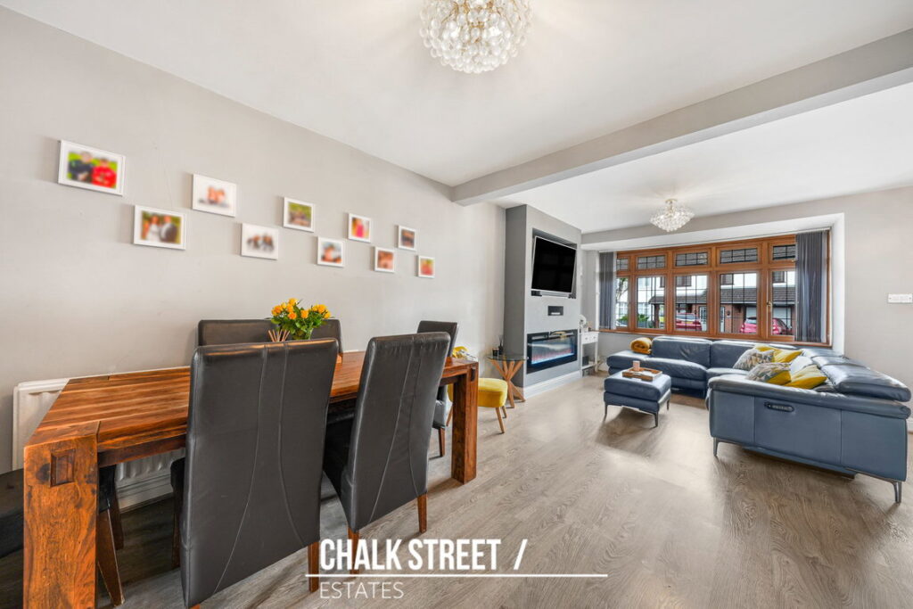 The ground floor commences with a bright open-plan reception and dining room, enhanced by a large front-facing window that floods the space with natural light. This room comfortably accommodates the corner sofa alongside a dining table and chairs, creating an ideal setting for modern family living. A separate section off to the side is currently used as a home office offering a practical space.