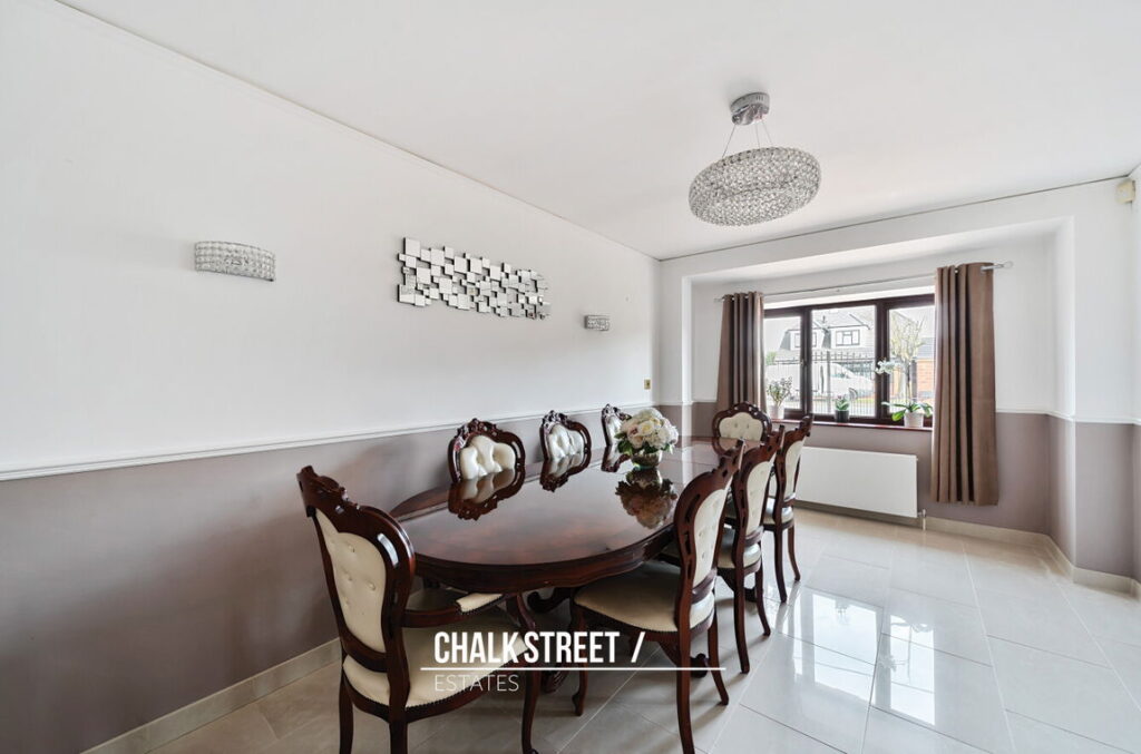 Positioned off the kitchen is the spacious dining room which measures 17’6 x 9’11 and enjoys stunning tiled flooring underfoot and a large bay window to the front elevation.