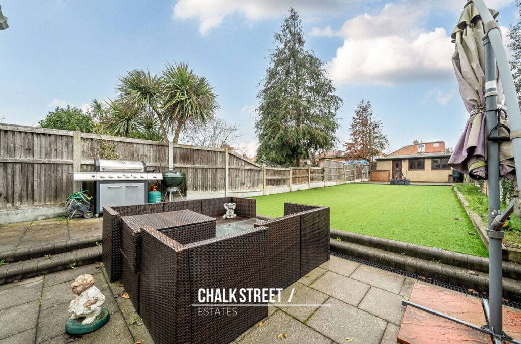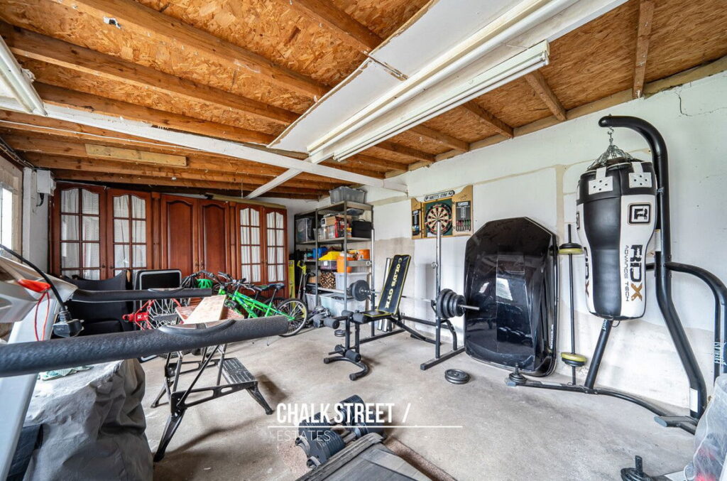 The south facing garden, measuring approximately 77ft in length, commences with a stone patio whilst the remainder is predominately laid with artificial lawn. At the base of the garden, there is a large outbuilding (19’1 x 13’4) which could be used as a gym, snug, home office or bar.