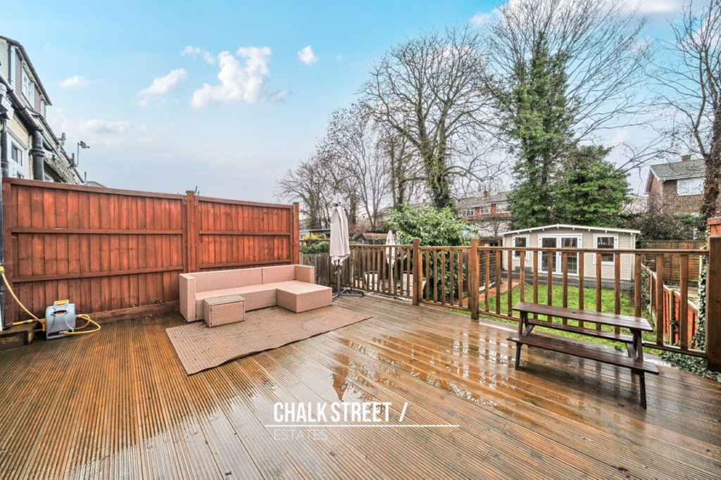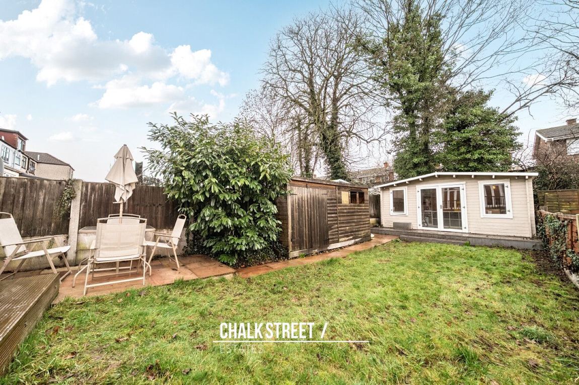 The south-east 61’ rear garden commences with a large decking area whilst the remainder is predominately laid to lawn. At the base of the garden there is an outbuilding currently being used for storage which also boasts lighting and electrics, providing an ideal space for a home office.