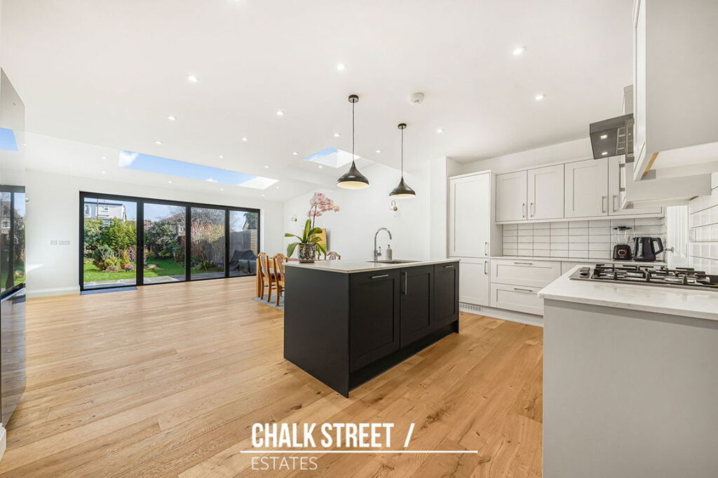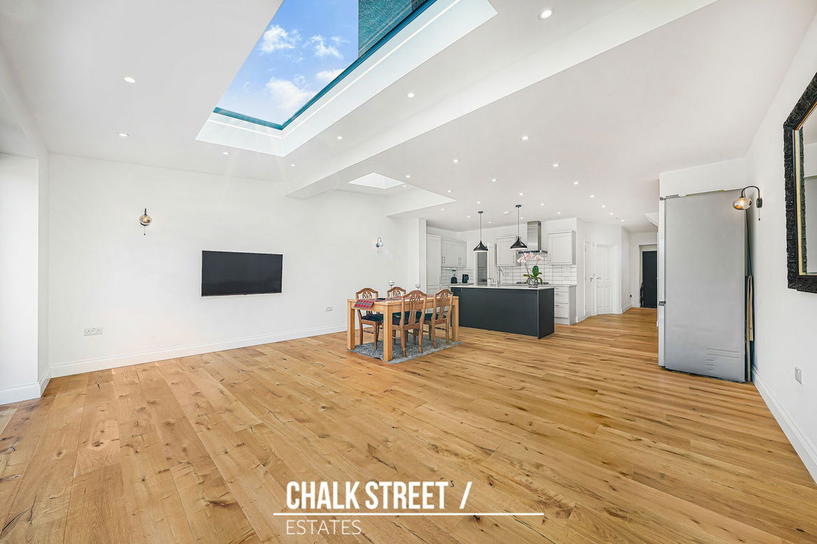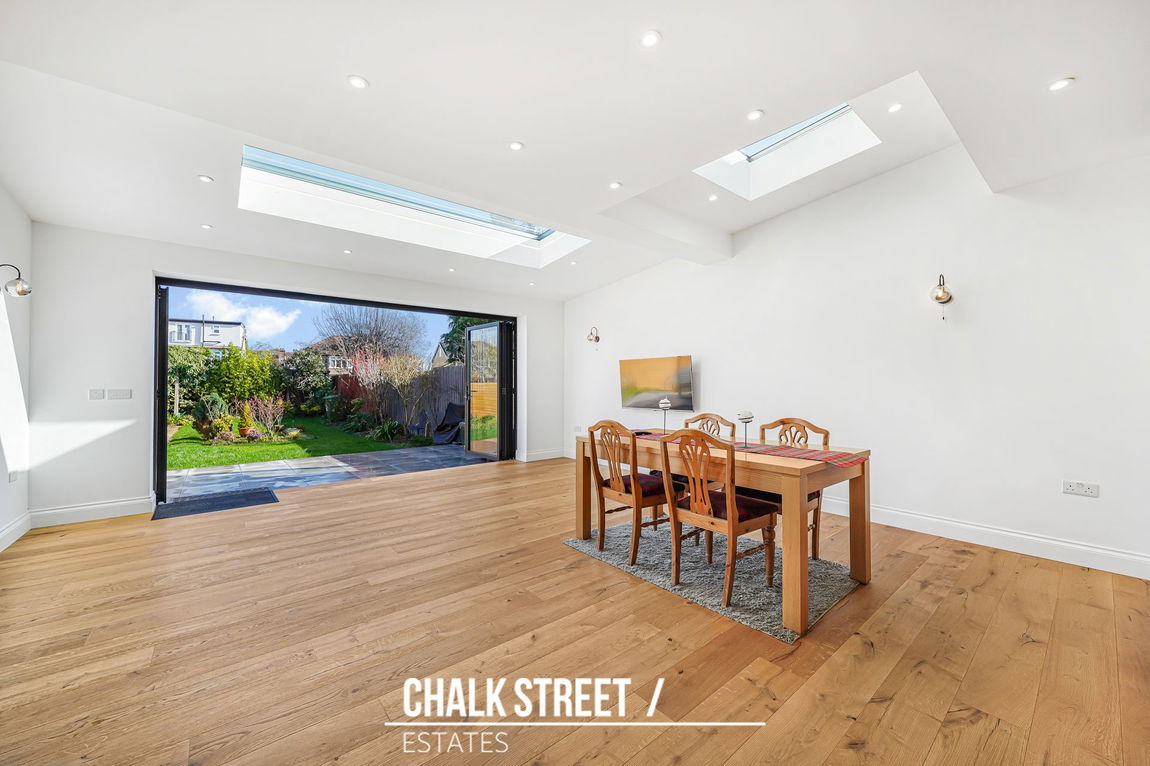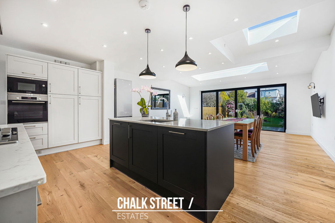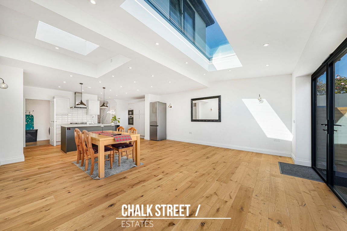 Spanning the entire rear of the property is the impressive open-plan kitchen / dining / reception room. This beautifully extended space has been designed with family life in mind. The kitchen is fitted with an extensive range of wall and base units complemented by quartz worktops with a beautiful breakfast-bar. Integrated appliances include a fridge-freezer, dishwasher, oven, microwave, gas hob and extractor hood, delivering both style and functionality. The extension creates a substantial dining and family area, enhanced by underfloor heating for year-round comfort. The overhead skylight draws in additional natural light, whilst bi-fold doors open seamlessly onto the rear garden.