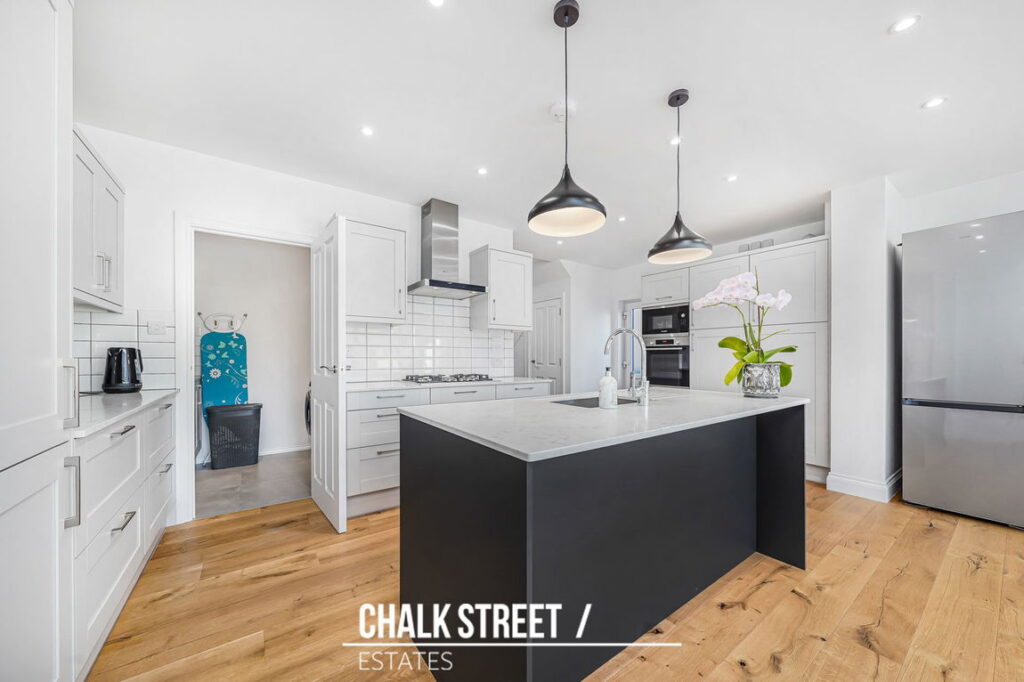 Positioned off the kitchen is a practical utility room, providing further storage units, additional worktop space, a sink and room for any additional appliances.