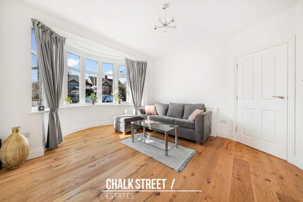 To the front elevation, the lounge is flooded with natural light from an attractive bay window. This spacious reception room features high-quality wooden flooring underfoot and offers a comfortable setting for everyday living.