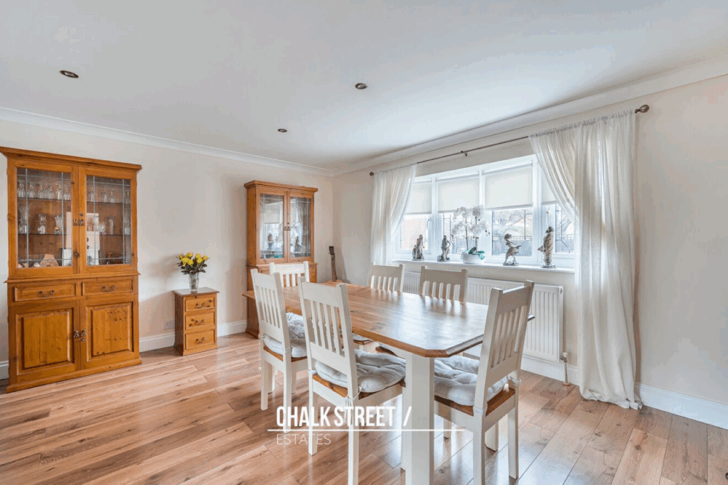 The ground floor effortlessly flows, creating an ideal environment for both everyday life and entertaining. Each reception area benefits from ample natural light and flexible arrangements to suit various needs. The kitchen is well-appointed, featuring ample worktop space for meal preparation, various wall and base units and integrated appliances such as washing machine, fridge and freezer.