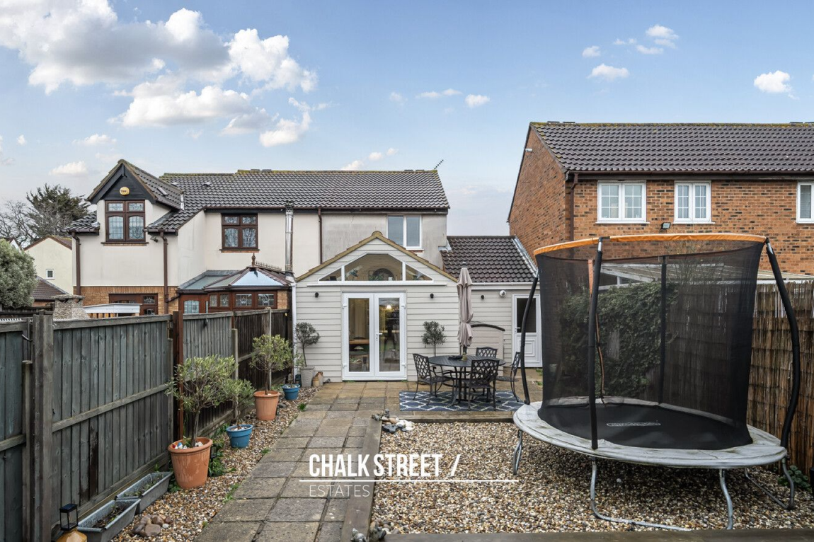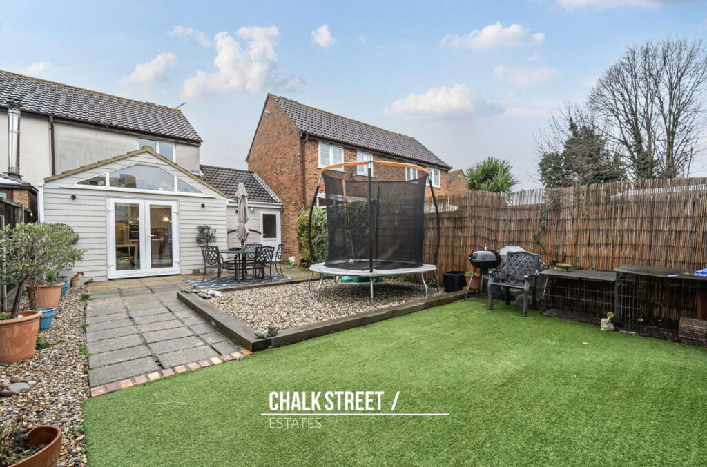 The rear garden commences with a large patio area whilst the remainder is laid with artificial lawn.