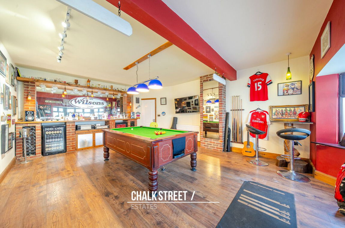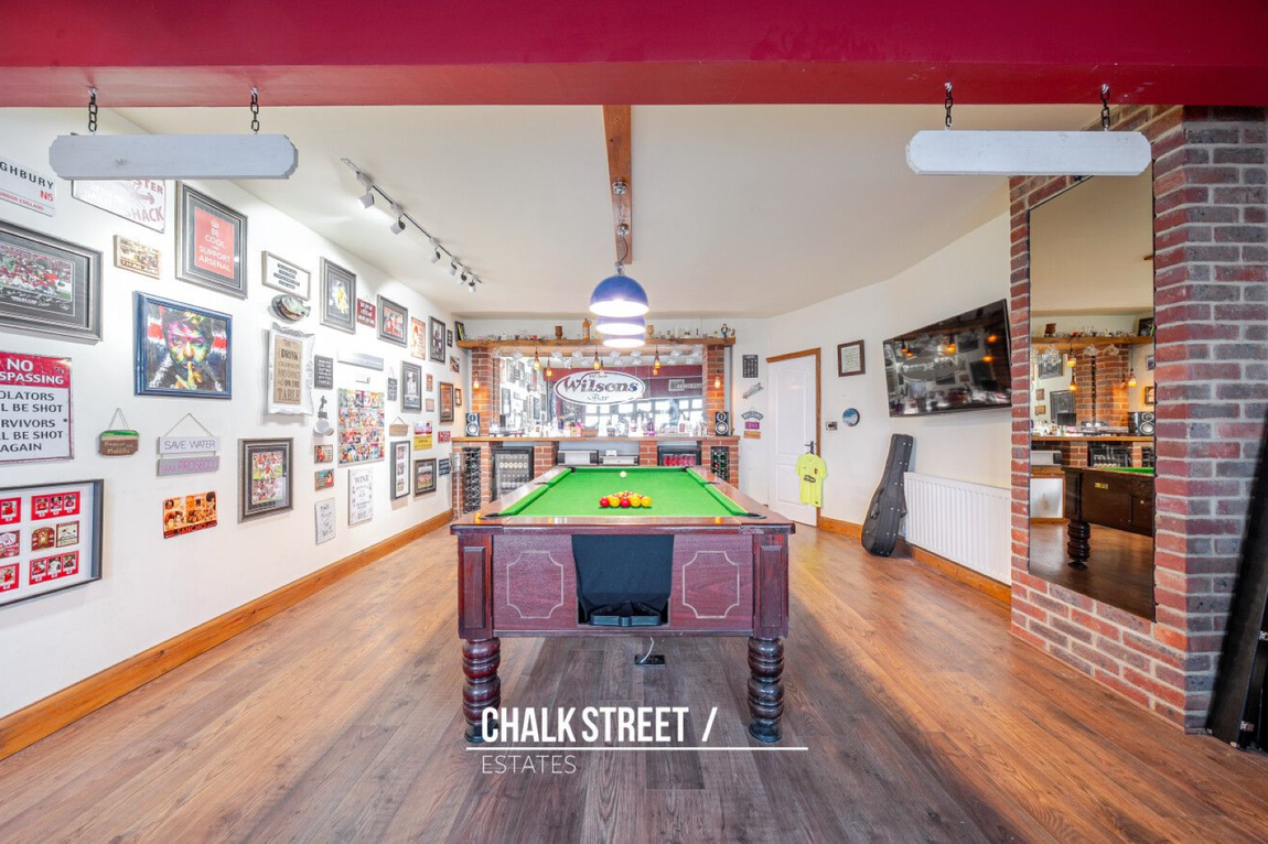 Upon entering the home, the bright and spacious hallway leads to the principal reception areas. To the front, a bay-fronted lounge currently used as a bar provides a stylish and versatile living space, whilst a cosy snug offers the perfect retreat for relaxation but could also be used for a dining room, home office or playroom.
