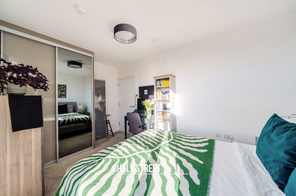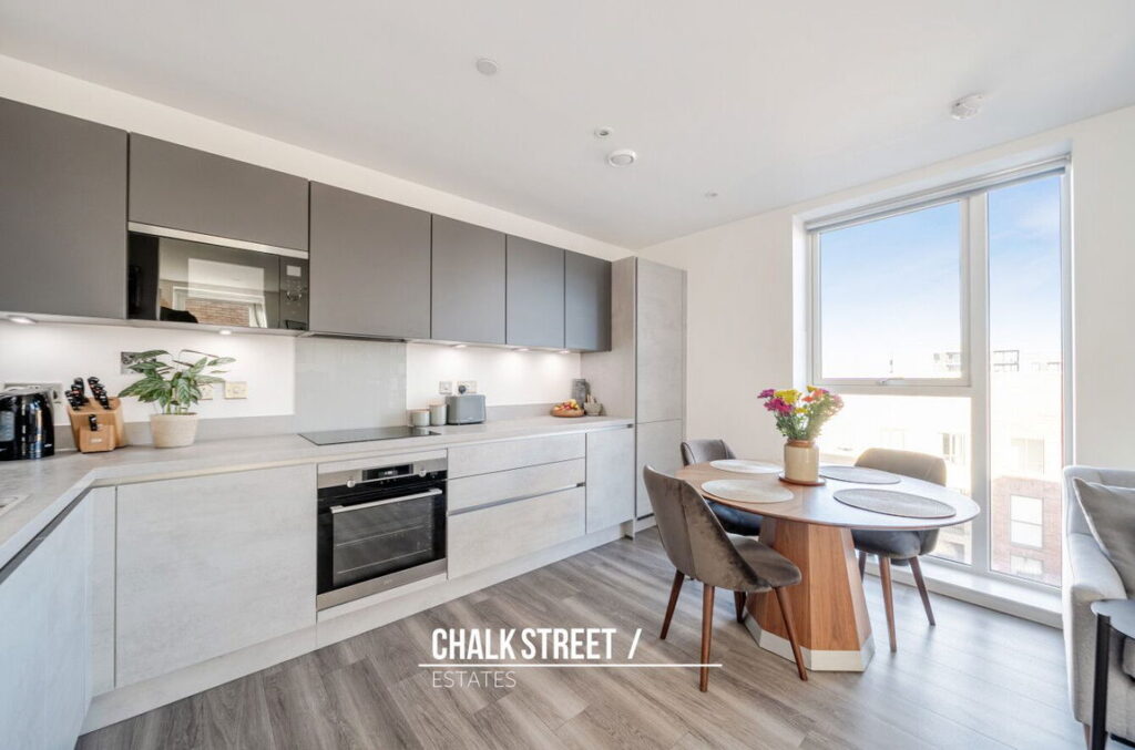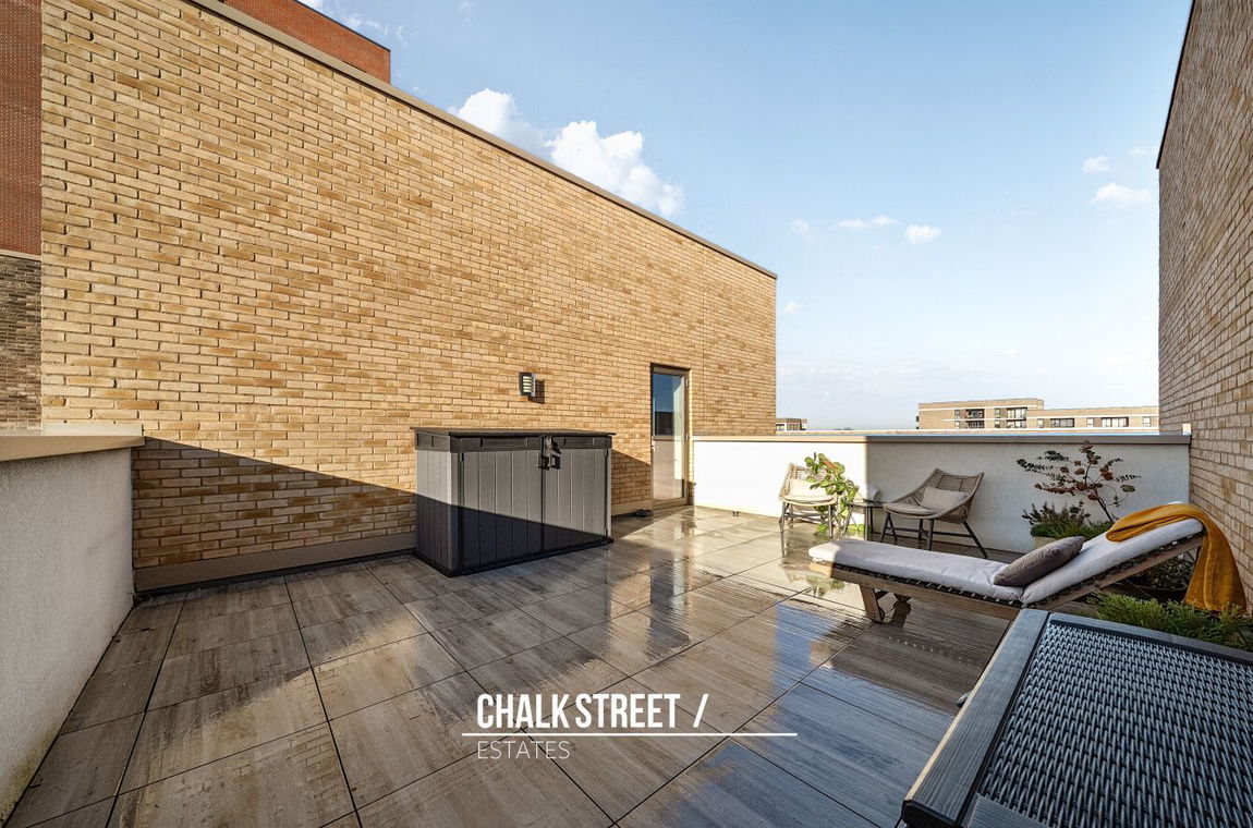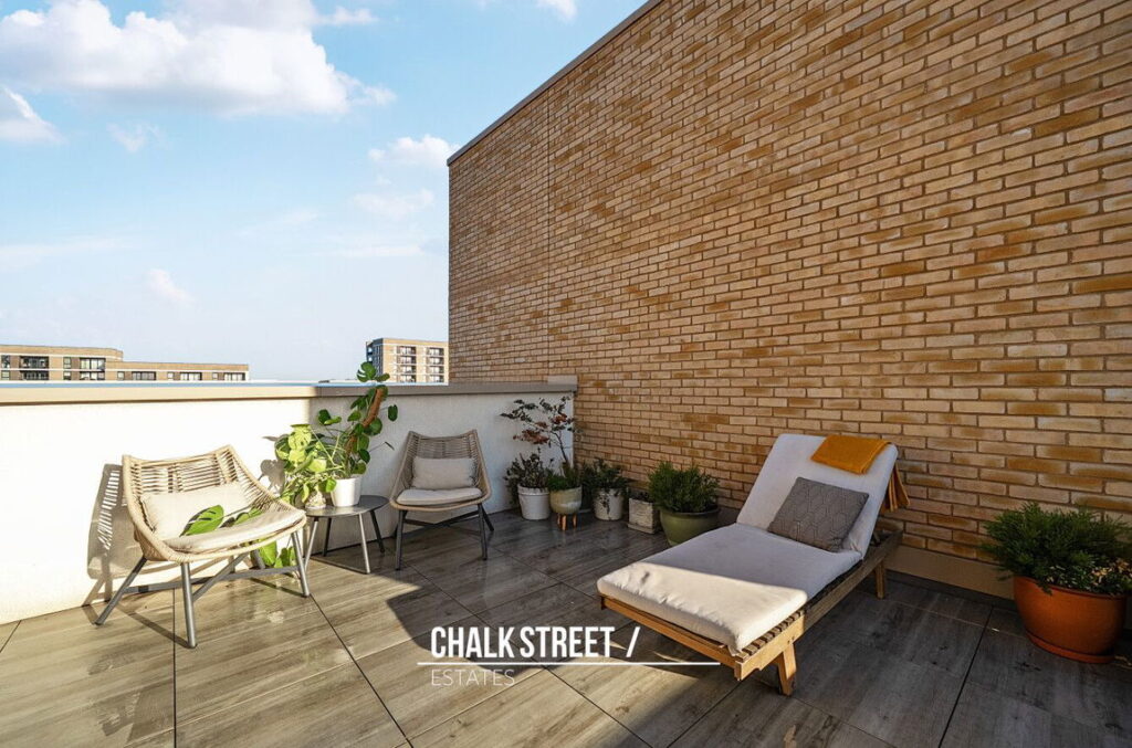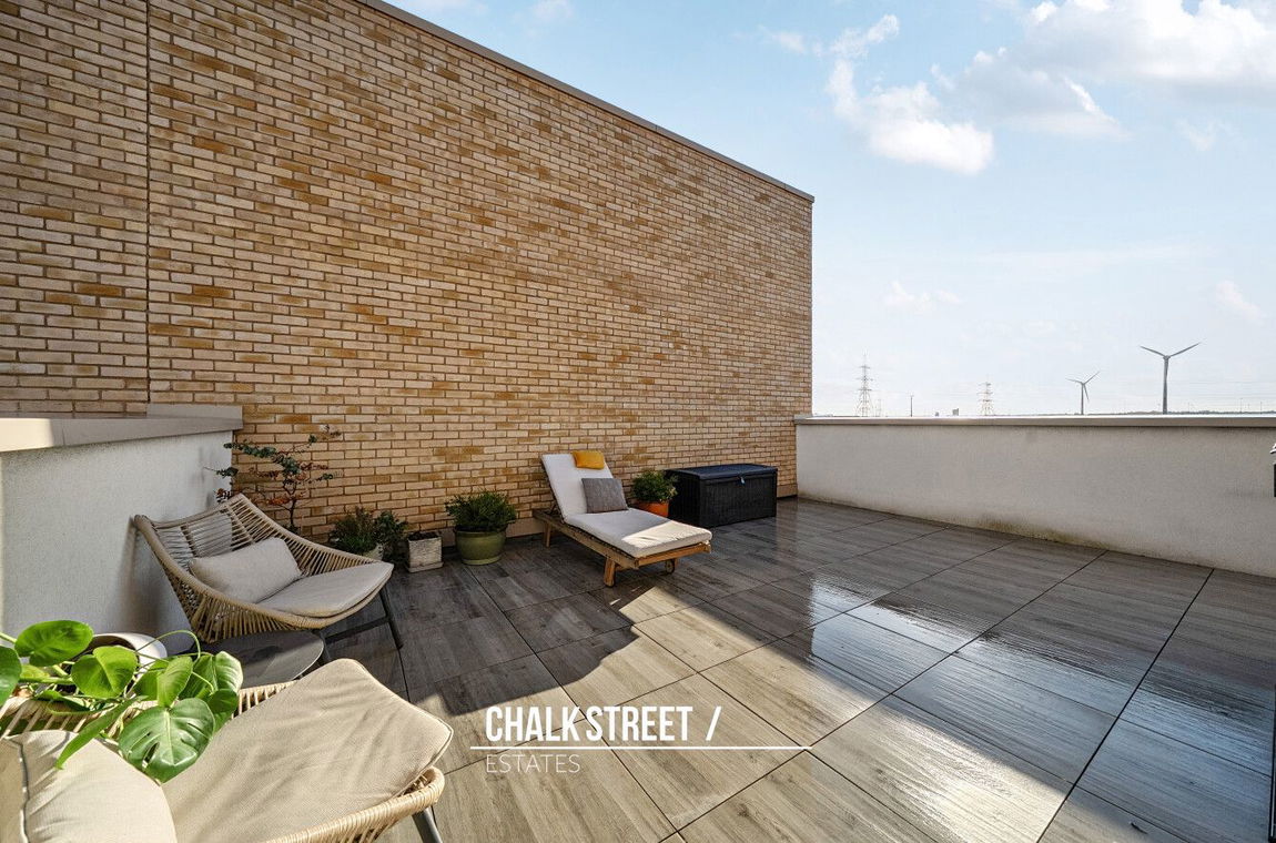 The stunning open-plan kitchen / reception / dining room measures an impressive 18’3 x 13’6 and enjoys dual-aspect windows, creating a light and spacious environment. The modern kitchen area is fitted with a range of wall and base units, integrated appliances, and generous worktop space. A standout feature of this property is the exclusive access to the substantial terrace area, extending 21’7 x 17’9, perfect for outdoor dining, relaxing, or entertaining in the warmer months.