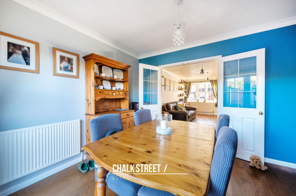 Positioned at the front of the home is the principal reception room which draws light from the large window and is well presented with a neutral palette. Double doors open onto the dining room at the rear of the home, which overlooks the rear garden via the double patio doors. Beautiful wooden flooring flows seamlessly underfoot between the two rooms.