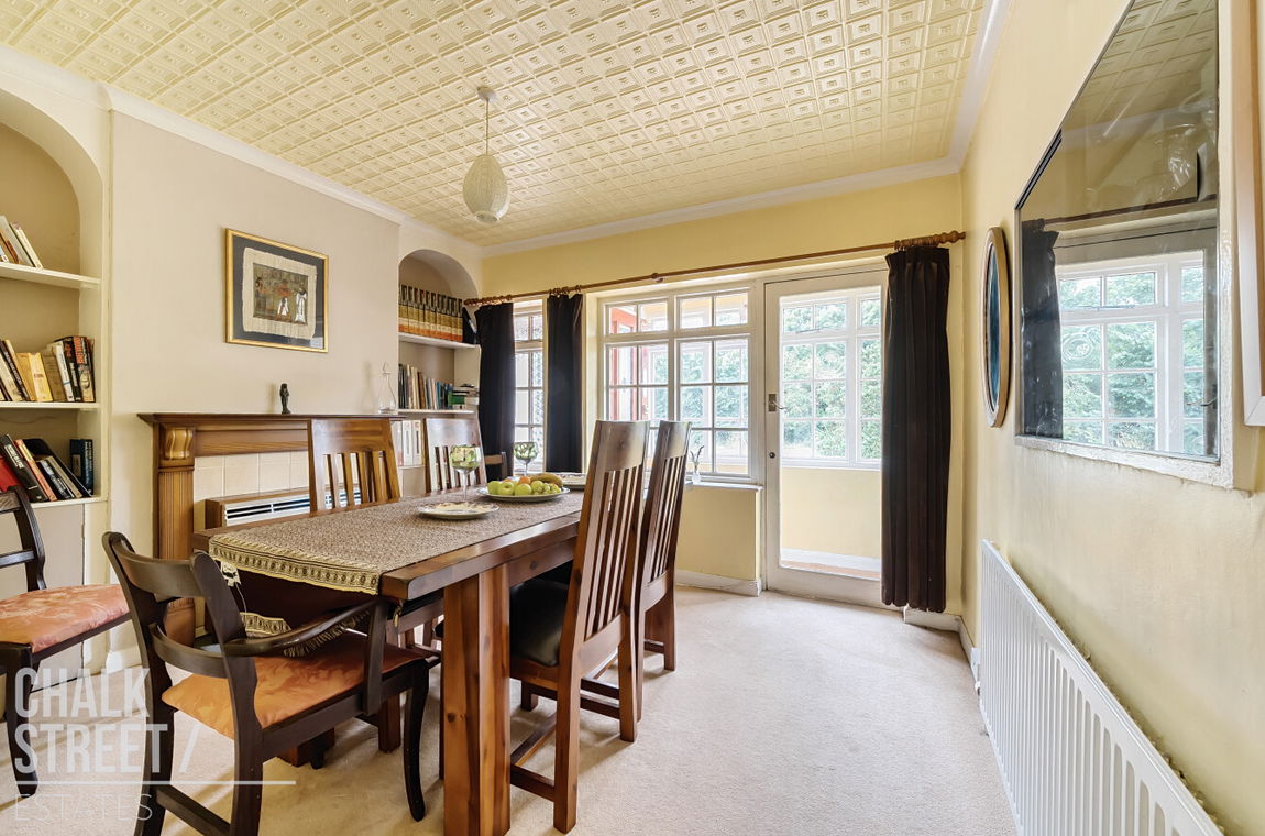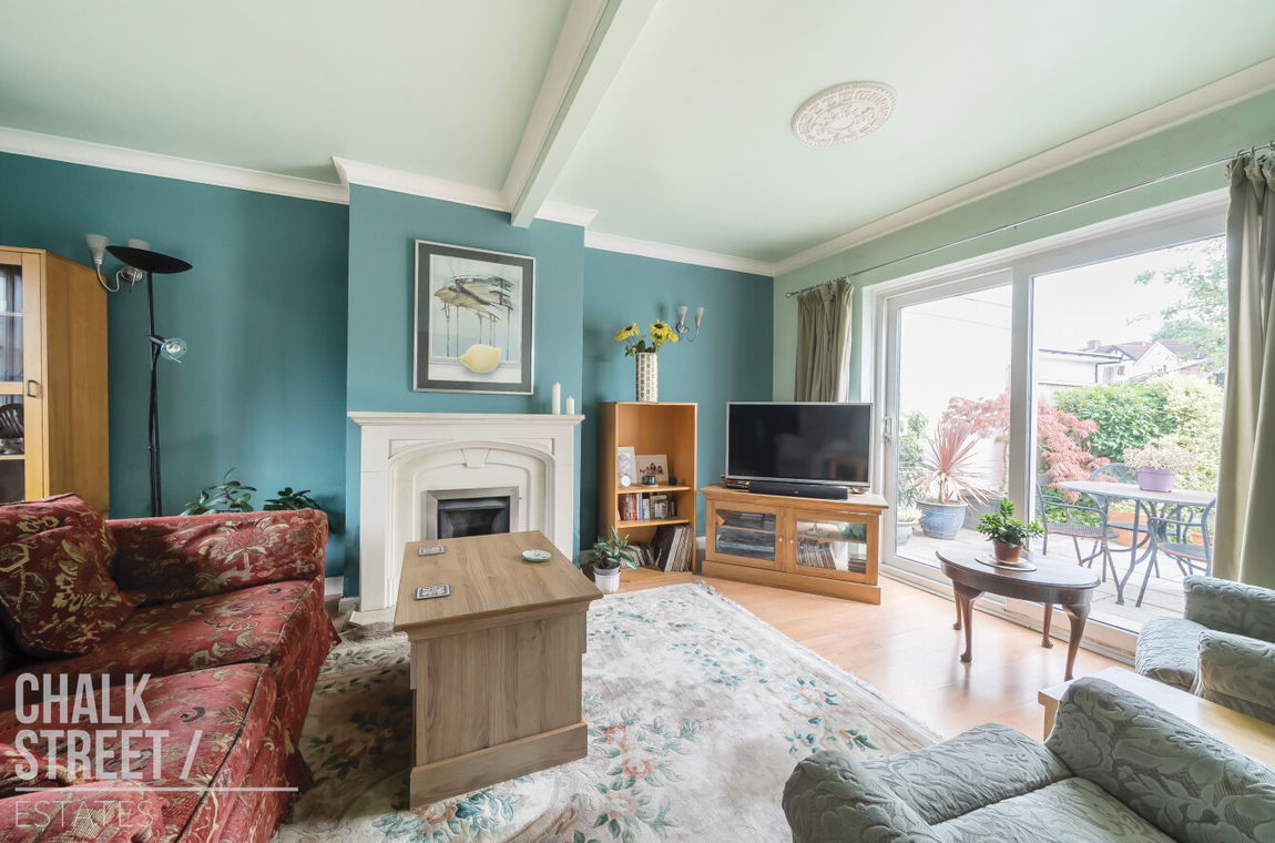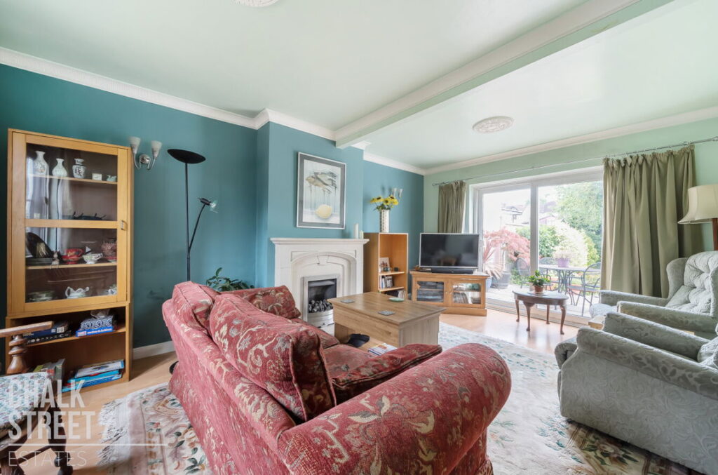 Spanning the left side of the home, the reception room is nicely presented and enjoys a centre fireplace. The large window to the front elevation and sliding patio doors to the rear, flood the room with natural light.