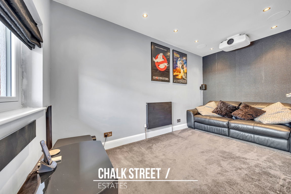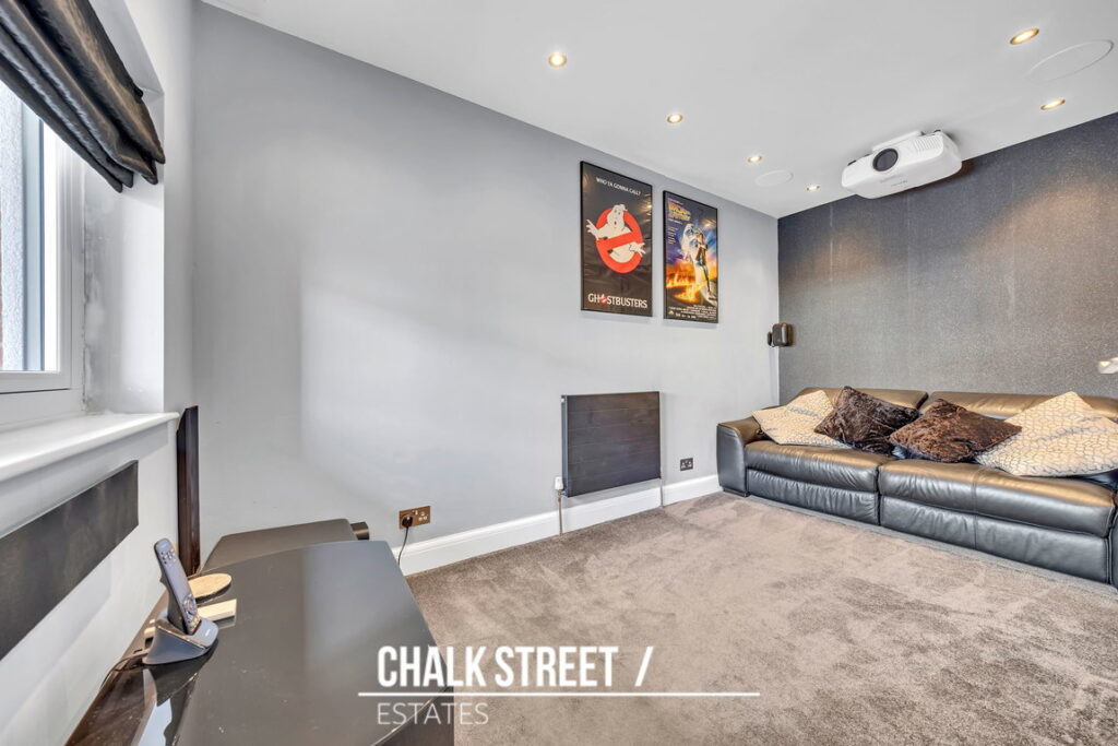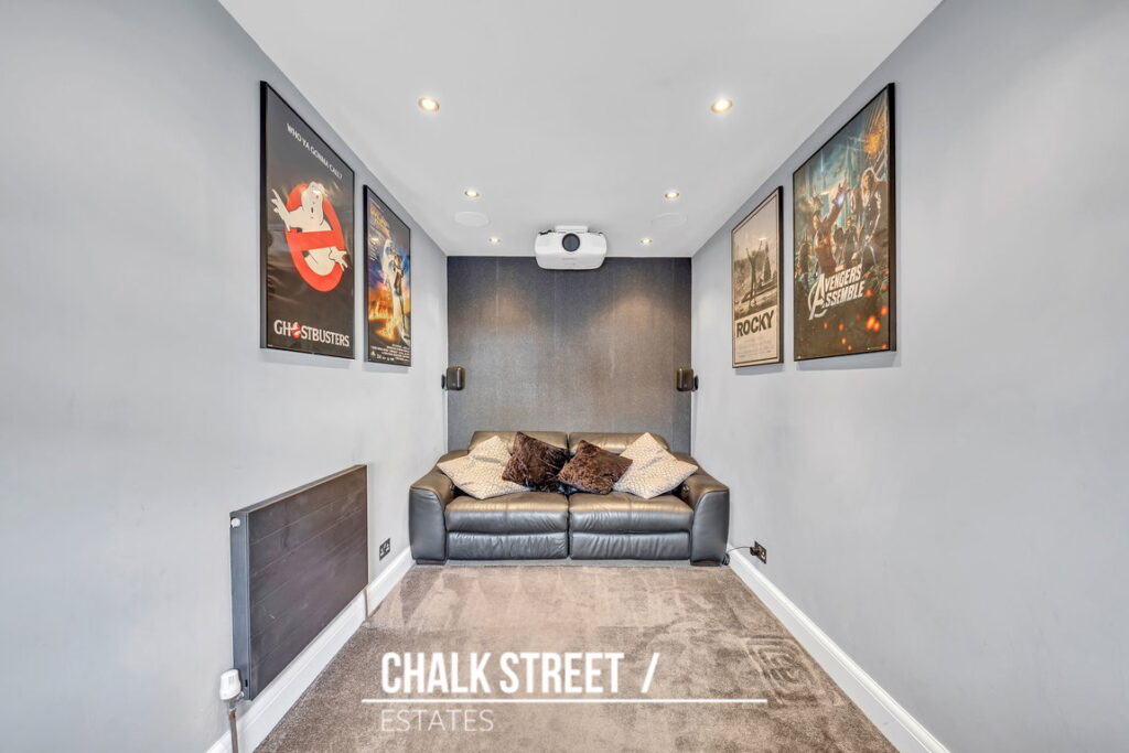 To the left, a converted garage offers a versatile second reception space, currently configured as a cinema room with a dropdown projector screen and ceiling speakers. This flexible area could easily serve as a dining room, home office, study, or playroom to suit your needs.