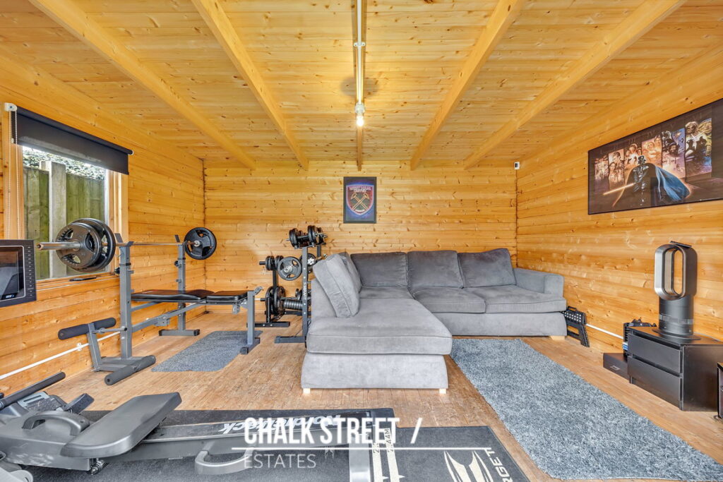The private, unoverlooked 66'5 rear garden begins with a generous patio area, perfect for outdoor dining and entertaining, with the remainder primarily laid to lawn. At the foot of the garden, a substantial outbuilding, equipped with lighting and electricity, is currently utilised as a gym and games room, offering flexible additional space.