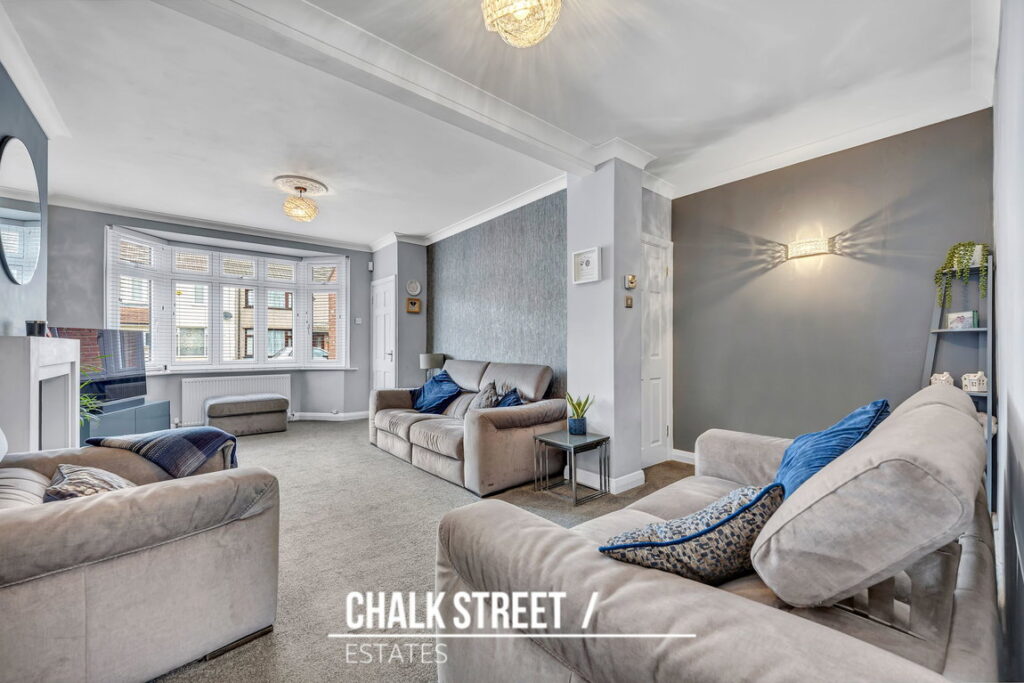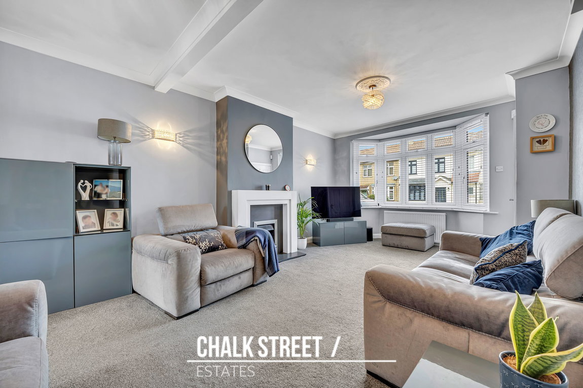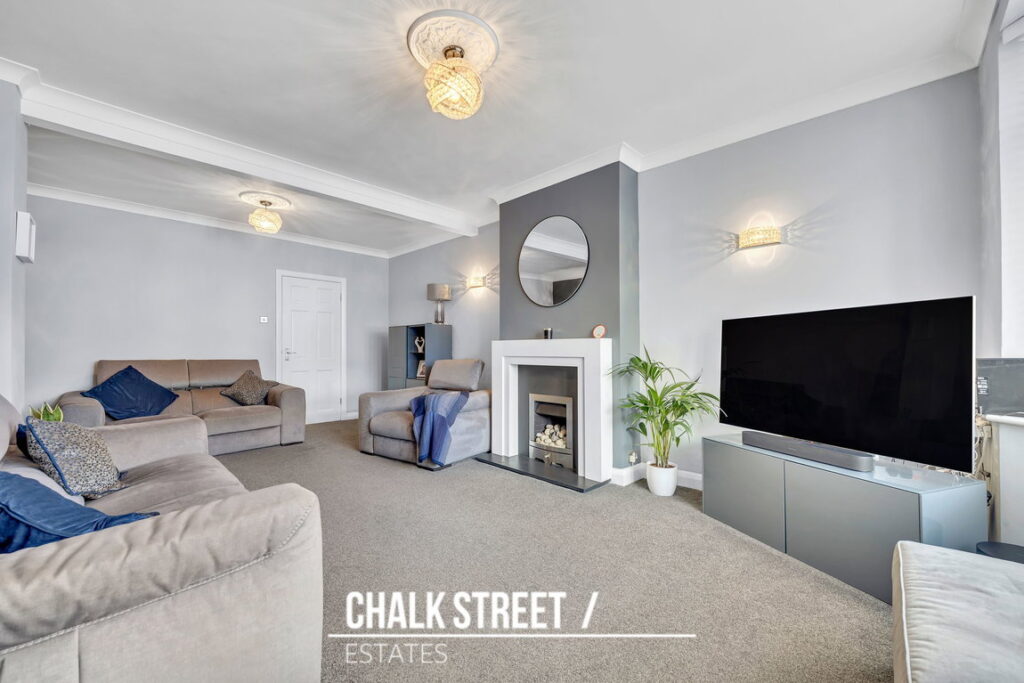 The spacious living room, measuring 21'6 x 15'5, is filled with natural light from a beautiful walk-in bay window. This comfortable space is centred around an attractive fireplace and features deep skirting boards, decorative cornice coving, a ceiling rose, and soft carpeting underfoot.