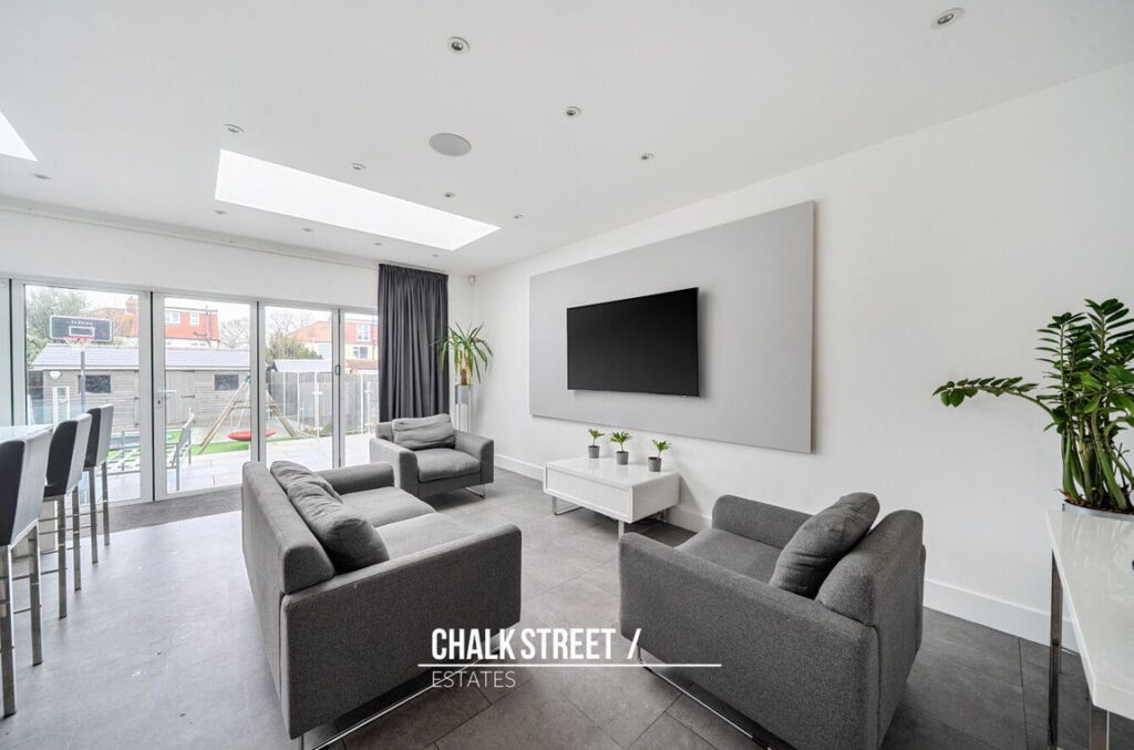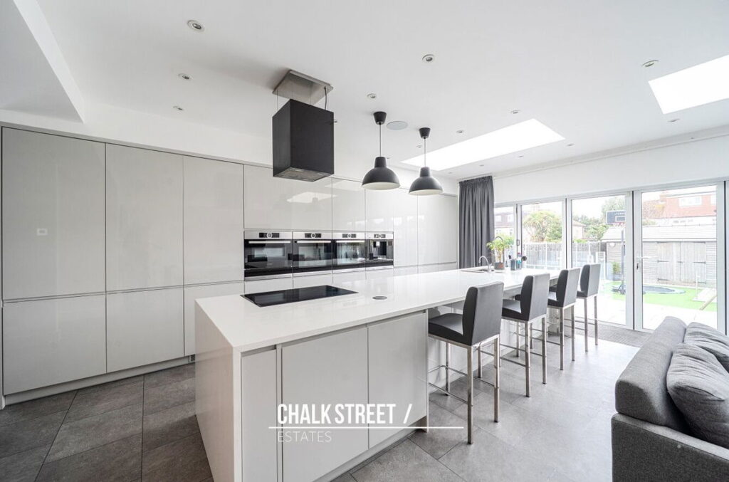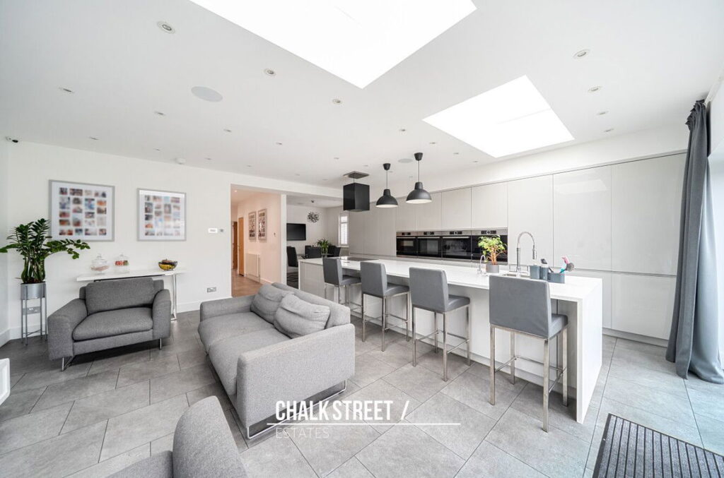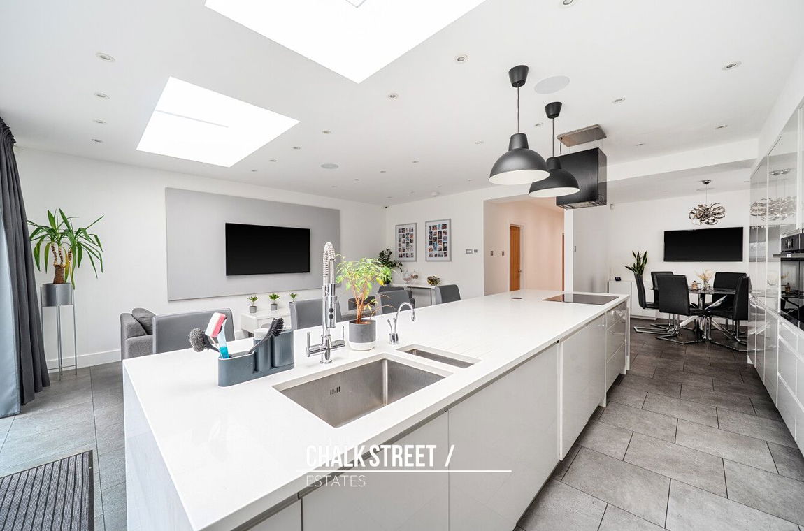 Situated within the rear extension is the impressive open-plan kitchen, dining, and reception room. Measuring 19'2 x 18'5, the modern area is ideal for family living and entertaining, offering generous proportions and abundance of natural light. The kitchen comprises numerous wall and base units, ample worktops a centre breakfast bar and room for essential appliances.