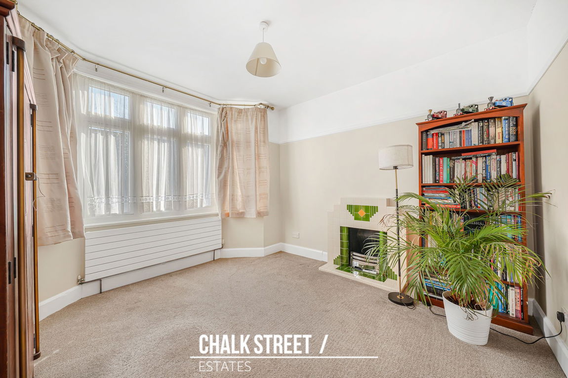 To the front, the main reception room is a bright and inviting space, enjoying an impressive bay window that fills the room with natural light. This room features an attractive fireplace, set against neutral décor and finished with plush carpet underfoot. This room, alongside the second reception room, offers an exciting opportunity for a buyer to infuse their personal style through modernisation.