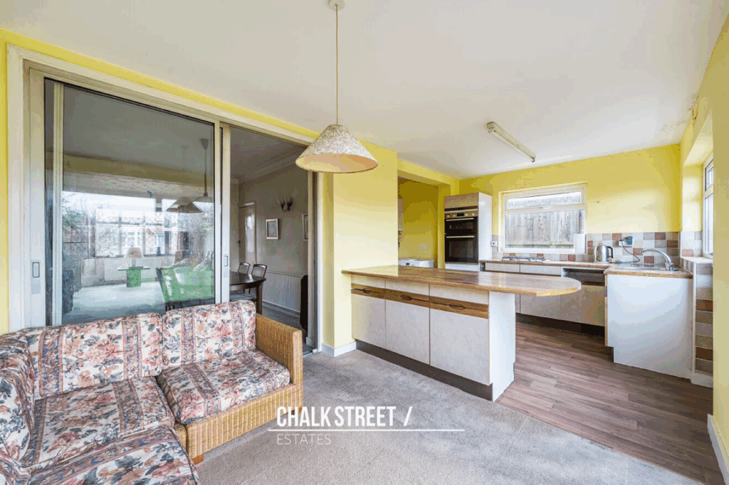 Positioned to the rear of this house is the kitchen / dining room, which comprises numerous wall and base units, worktops extending into a breakfast bar and sliding patio doors opening onto the rear garden.