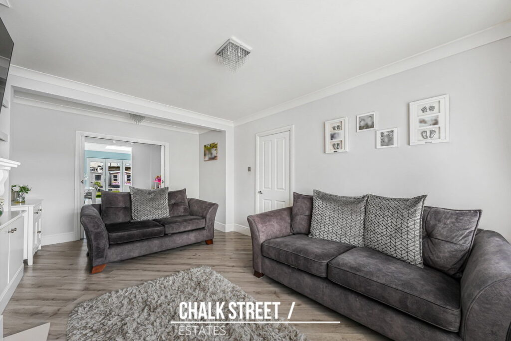 To the front of the home, flooded with natural light, the reception room is beautifully decorated with modern tones.