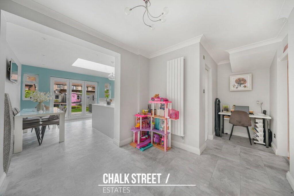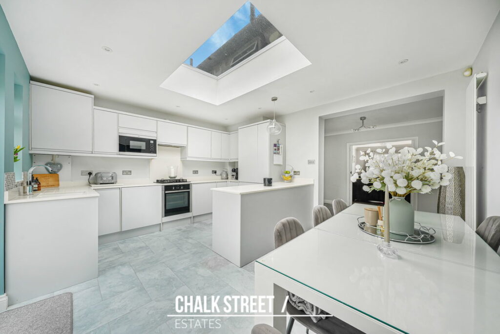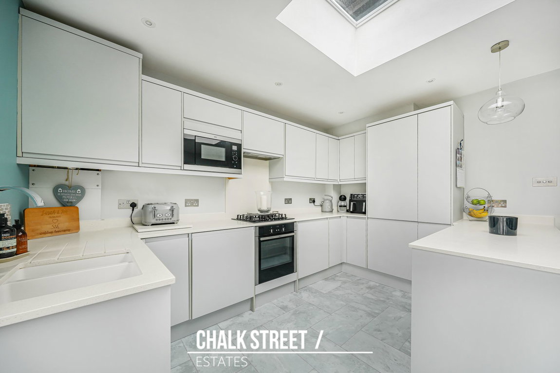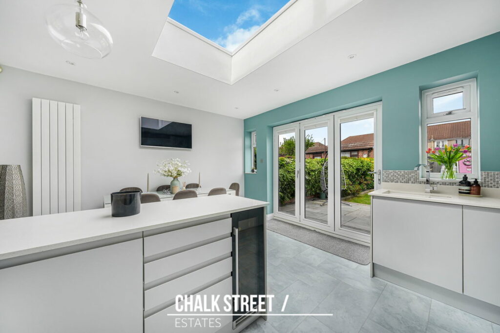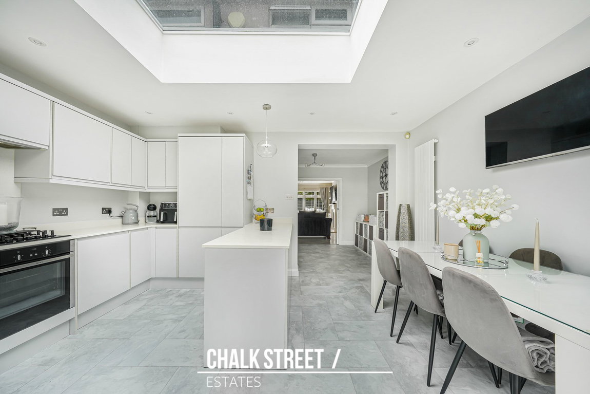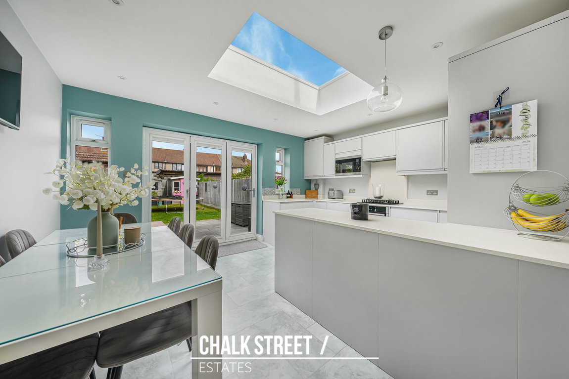Positioned within the rear extension and spanning the rear of the home, the stylish open plan kitchen / dining room comprises numerous wall and base units, ample worktop space, a centre breakfast island and room for essential appliances. Bi-folding doors and an over-head skylight flood the entire space with an abundance of natural light.